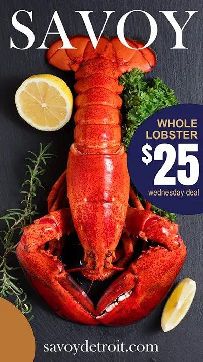 Indulge in a seafood feast with our irresistible Whole Lobster Special at SAVOY Restaurant in Detroit! For just $25, enjoy a delicious lobster, perfectly steamed and served with warm, melted butter.